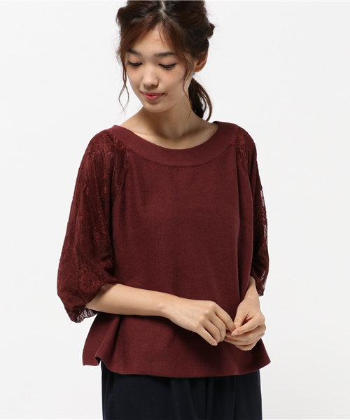 トレンドのたくさん詰まった旬顔トップスややゆったりとしたシルエットの綿ニットはラグランスリーブの異素材切替タイプ。 レースのバルーンスリーブが今年らしい。 ボートネックだから首周りをスッキリとみせてくれるコーディネートの主役になる一枚。