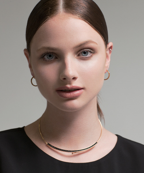 トレンドアイテムのチョーカー。ゴールドタイプを選べば、カジュアル過ぎないのでシックなスタイルにもぴったり。ネックレス感覚でつけられるので重宝します。