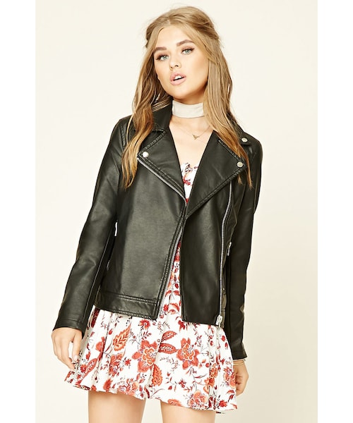 A faux leather moto jacket featuring an asymmetrical zippered front, zippered front pockets, notched lapels, and long sleeves with zippered cuffs. Shell: 100% polyurethane Backing: 100% viscose Lining: 100% polyester Hand wash cold Made in China