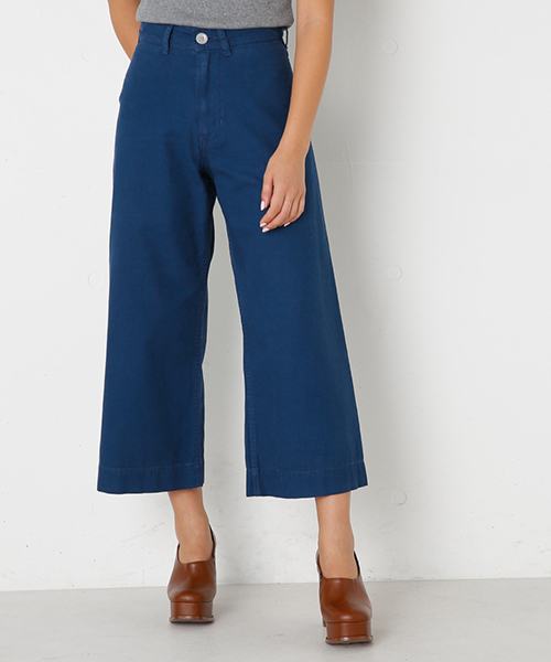 きれいなシルエットのワイドクロップドパンツは、ワークウェアの定番素材として古くから使われているダック素材を使用。ダック素材は、太めの糸を密に織り込んだ平織りの生地になり、ハリがあり、耐久性に優れています。その素材をパンツに落とし込み、脇に接ぎ線を入れない事でハリのあるきれいなシルエットにしています。トップスをINして、足元は素足にパンプスやミュールがおすすめです。