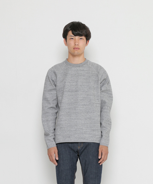 ジャージのようにサラッとした肌触りが特徴のプルオーバーのスウェットシャツ。 霜降りの雰囲気が良く、スポーティやアウトドアなスタイリングにピッタリな1枚です。 ラグランスリーブに近いデザインですので、肩幅も気にならない作りになっております。