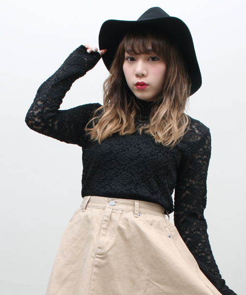 プチハイネックのデザインのレーストップス。 スカンツやフレアパンツにインしても◎ モノトーンカラーで、これからの季節におススメです。 ※レース素材の特性上、表面の粗い素材に擦ったり、 アクセサリーやバッグなど引っ掛けや引っ掛かりやすいものの取扱いにご注意ください。