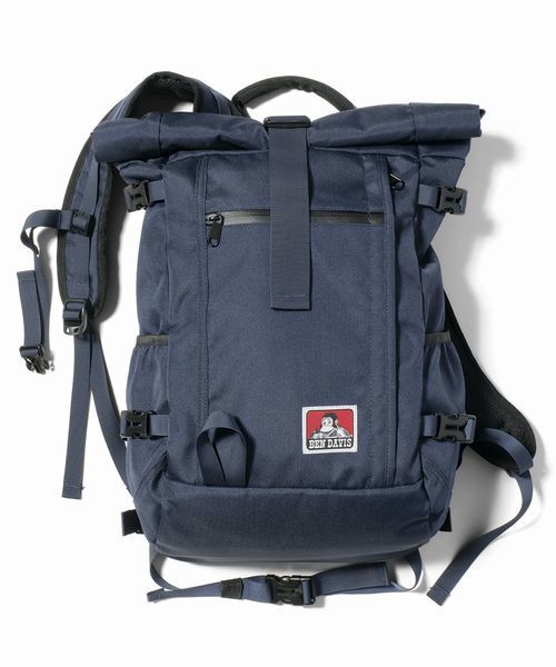 BEN DAVIS ROLL-TOP DAYPACK ベンデイビス リュックメインポケットの開口部は一度スナップボタンで留めてから、丸めて閉じるロールトップタイプのリュックになります。 底部の重心を身体方向に傾斜させたデザインにより、肩などへの負担が軽減されます。 メインポケットの他に正面とサイドポケットが付いた、収納力に優れたリュックです。また、身体に当たる部分はクッション入りのメッシュ素材を使用する事によって、長時間の使用でも疲れにくいデザインになっております。 ショルダー部分にはチェストベルトとウェストベルトがそれぞれ付いておりますので、しっかりと身体に固定することが出来ます。