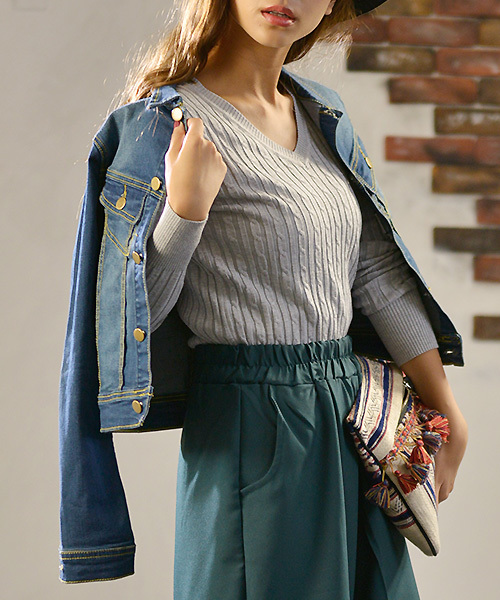 ◇◇チクチクしない優しい肌触りが◎ coca定番人気のシルエット美見せニットが今年も再入荷致しました!◇◇ 伸縮性抜群のケーブル編みVネックニットトップス。腕を通した瞬間、肌に吸い付くように体のラインにフィット。縦のケーブル編みラインが気になる部分をカバーし、スッキリとした印象に。Vネック部分はデコルテが綺麗に出る開き具合にこだわりました。アウターを着てもごわつかず、着膨れしないのが嬉しいポイントです! 生地感:ハイゲージなめらかニット 伸縮性:あり 透け感:ほぼなし 注意点:前身頃のみケーブル、ひっかけ注意、ニット特有の匂いがある可能性あり 伸縮性のあるニット生地のため納品時に見た目のサイズにばらつきがある場合がございますが、着用の際に差はございません。 染色の関係上入荷毎に色味に差がございます。 ▼モデル着用写真は撮影環境により、多少実際のカラーと異なる場合がございます。タンブラー乾燥はお避け下さい。