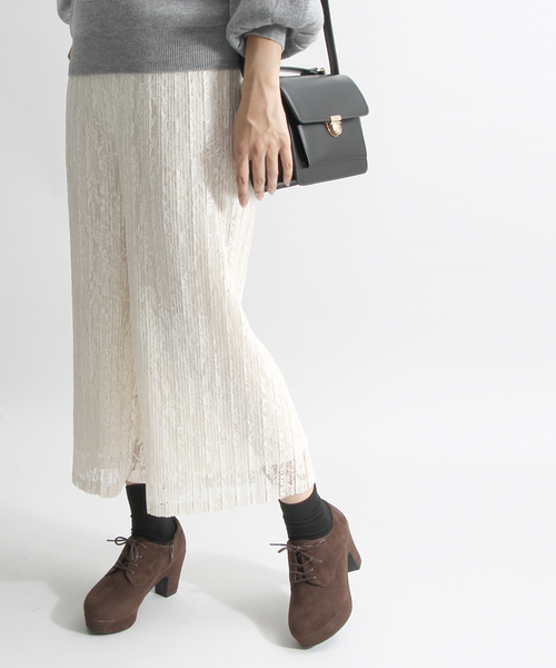 プリーツデザインのスカンツ。ストンとしたワイドシルエットで、スタイルよく見えるラインにこだわったひと品。繊細なレースが着こなしにフェミニンな雰囲気をプラスします。ウエストはゴム仕様にし、リラックスして快適に着用頂けるように仕上げました。今季はショート丈トップスと合わせるような着こなしや、ベレー帽、チョーカーなど、小物で遊びを効かせたコーディネートもオススメです。 ※実際の商品と仕様、加工、サイズが若干異なる場合がございます。