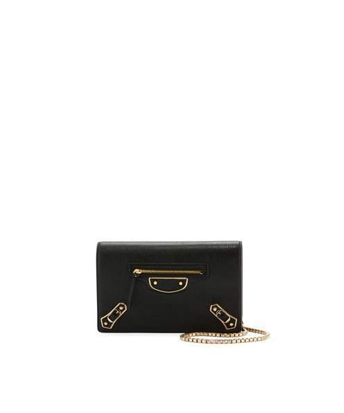 Balenciaga grained goatskin wallet-on-chain with golden hardware, including stud and buckle detail. Chain shoulder strap can be tucked inside, 22" drop. Flap top with snap closure. Front zip pocket. Slip pocket under flap. Interior, one zip pocket; two bill and 12 card slots. 5.3"H x 8.3"W x 1.3"D. Made in Italy.