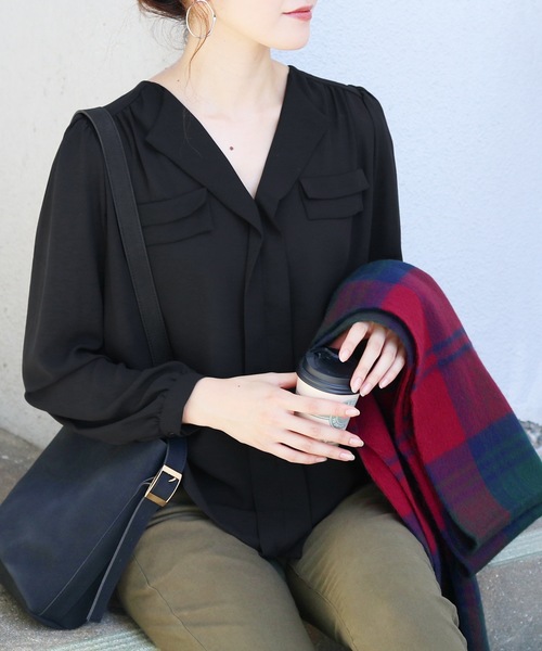 大人気ブラウスに新色追加!! しっとりとした『上質』で『上品』なとろみブラウス 【ポイント】 大人カジュアルスタイルに、結婚式やおよばれにまた、オフィススタイルになど1年中着まわしのできるアイテムです。フェイクポケットが、シンプルなシフォンブラウスのアクセントに。 後ろにはタックが入っているのですらっとした広がりすぎないシルエットを演出してくれます。トレンドのファーアイテムとも相性◎ 大人Vネックラインがきれいなデコルテに見せてくれ、しっかりギャザーの入ったふんわりパフスリーブが二の腕カバーもしてくれます。 ワイドパンツやコートとも相性◎ コートなどのアウターとあわせてももたつかずすっきりとした着心地。 【生地感】 絶妙なとろみの高品質シフォン素材。 【サイズ感】 しめつけ感があまりなくゆったり着れるサイズ感。 普段Sサイズ着用の方⇒○ 普段Mサイズ着用の方⇒○ 普段Lサイズ着用の方⇒○ ※体型やお好みにより個人差がございます。 あくまで着用時の雰囲気の目安としてお考え下さい。 ※モデル着用写真は撮影環境により、多少実際のカラーと異なる場合がございます。