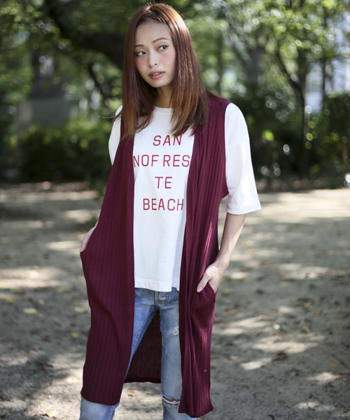リブ編みのベストの様な上品な雰囲気を合わせたロング丈の綺麗に合わせれるニットアイテムが登場! カットソーやブラウスとのレイヤードスタイルにも相性の良い袖なしタイプのロングカーディガンになります。 色目もこの時期から活躍する、ワインレッド、グレー、 ベージュの大人のスタイリングに相性の良い3色展開になります。 デニムボトムスとカットソーのシンプルなスタイリングに1枚足して頂くだけでトレンドのコーディネートを楽しんで頂けます。 アウターのインナーにも使えるロング丈アイテムは保温性もあり秋冬のシーズン中で長くお使い頂ける今季おすすめ羽織り物になります。