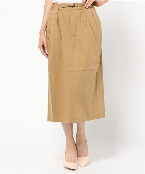すっきりとしたラインのタイトスカート。共地ベルトでウエストマークができるので、旬のボトムインしたコーディネートとも相性が良いです。後ろにはスリットを入れ、すっきりとしたシルエットですが脚さばきが良く歩きやすい。カジュアルにもきれいめにも合わせて頂けるアイテムです。