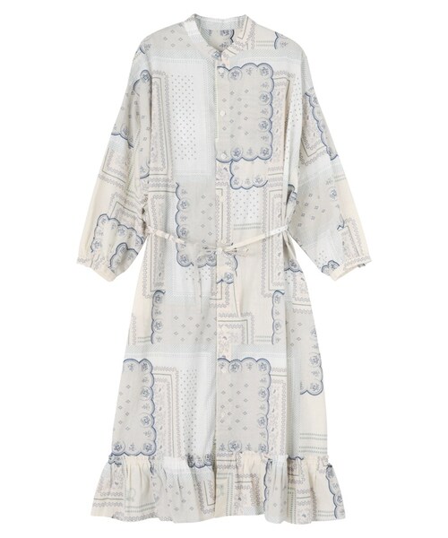 ヴィンテージのハンカチ柄を元にしてコラージュした柄をさらっとした生地にプリントしました。ゆったりとしたシルエットのワンピース。やや肩に沿ったタイプのスタンドカラー、袖口にはギャザー、裾にはギャザーの入ったフリルが付いて、人形が着てるような服をイメージでデザインされています。またウエストには紐が付いており、表情豊かに着れる1枚になっています。Torso:H163.5 B80 W58.5 H86 着用サイズ:02サイズ