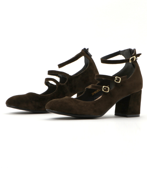 3本の華奢ストラップが女性らしさを引き立てる、クラシックレディなパンプス。ラウンドトゥのシルエットもガーリーな印象を与えてくれ、起毛ボディのマットな質感でどんなコーディネートにも品良く馴染みます。バックZIPで脱ぎ履きしやすく、インソールにはクッションが入っており足の負担も軽減◎ヒールは高すぎず、着地面も広いので、安定感のある履き心地なのもポイントです。ソックスやストッキングといったレッグウェアでも遊べる1足。