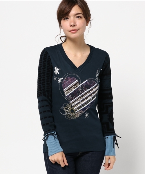 ネイビーの長袖Tシャツ。Vネック、なめらかな肌触りで快適な着心地。パッチワーク、刺繍ディテール、袖口のリボンに一目惚れしそう。