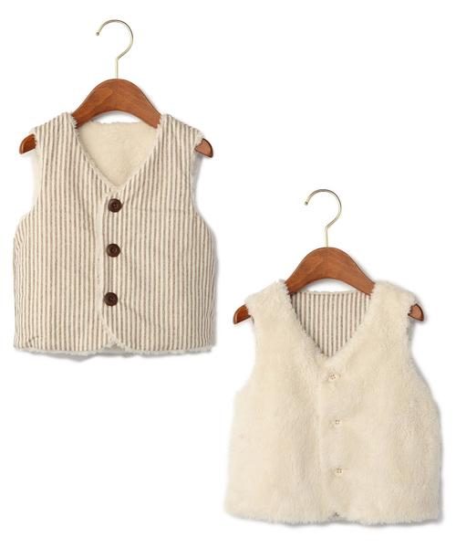 リバーシブルのベストが入荷しました。もこもこしたボアがとってもキュート!触り心地が良いので肌に触れても安心です。裏側はユニセックスで使いやすいストライプ柄で仕上げました☆パンツスタイルはもちろん、スカートやワンピース等にも相性抜群◎アウターでは暑い日に、ベストは重宝しますね♪■シリーズでベビーサイズ(ボア×チェック)のご用意もございます。~セール期間中のグリーンレーベル リラクシング各店への在庫のお問い合わせに関して~ セール期間中、セール品の在庫の有無に関して店舗ではお答えできない場合がございます。 また、セール期間中の店舗でのセール品のお取り置きはお受けいたしておりません。予めご了承下さい。 品番:3825-199-0493