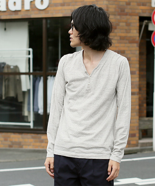 「V字のヘンリーネックがアクセント」 ムラ感のある糸の表情が豊かな、 V字のヘンリーネックタイプの長袖カットソーです。 適度な柔らかさと芯のある素材を メリヤス編みにしているので、薄手でも頑丈さがあります。 生地の表面に細かな凹凸があり、 ざっくりとした風合いなのでラフ感のある 自然な仕上がりになっています。 サラッと一枚で着ても、インナーとしても アクセントになるアイテムです。 「素材」 ラフィー糸の特徴である不揃いな糸質と、 ざっくりとした表情になるメリヤス編みが 表面に細かい凸凹を生み、 シンプルでも表情が豊かな生地になっています。