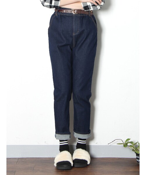 ほどよくゆるいシルエットがはきやすい。さりげなく気になるラインを隠しつつ、足元に向かって細身なテーパードシルエットだからすっきりと見えます。チェーン柄の三つ編みベルトを合せれば今っぽいカジュアルコーデが即完成!