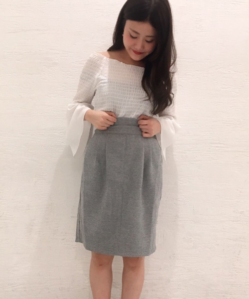 ウエストにキュートなフリルのついたミニのタイトスカートです。フロントにとったタックと後ろのゴム仕様で、腰回りは程よくフィット。裾まできれいなラインを生み出し、すっきりと着こなせます。温かみのあるジャガードは肌寒い季節におすすめ。ふんわりとしたトップスもジャストサイズの物もどちらもよく合い、女性らしい着こなしが楽しめます。