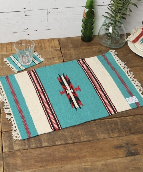 ネイティブ柄のセンターマット。 食卓だけでなく、玄関やカウンターキッチンの上に観葉植物を乗せたり。 棚の上に敷いて、インテリア小物を置いてみても素敵な演出ができます。