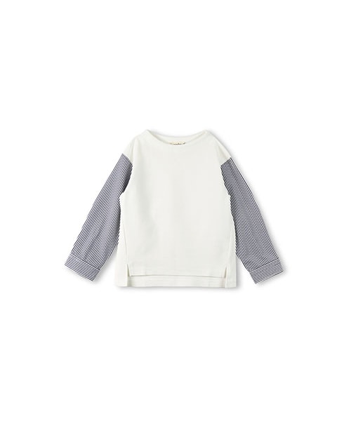 ストライプのシャツ袖仕様がオシャレな長袖Tシャツです。サラっとした肌触りで通気性もよく爽やかな着心地なのがポイントです。ゆるやかな曲線で横に広くあいたボートネックは大人っぽい雰囲気を出してくれます。※80cmから90cmは、後ろボタン仕様となります。