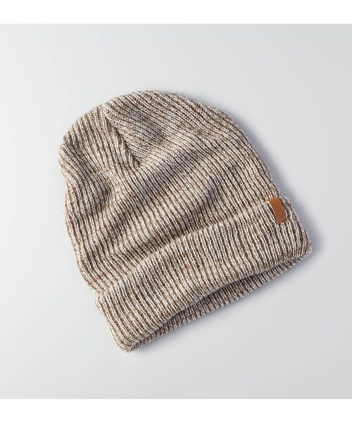 ソフトな肌触りのリブニット。 ニュアンスのある段染め糸を使用。 アクリル100% 、ニットビーニー、マールドヤーン(段染め糸)使用、ターンアップカフ、フェイクレザーのロゴタブ
