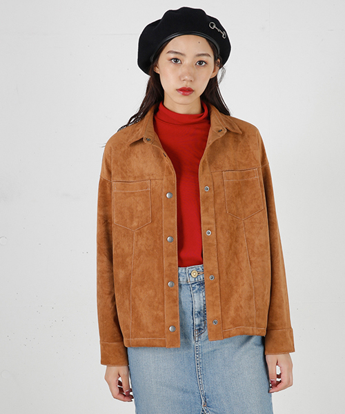 【SUEDE LIKE SHIRTS JKF】 すこしオーバーサイズでメンズライクなシルエット。カラーはCAMやPNKといった女の子らしいものを展開。フェイクスエードを使用しているため、デイリーに着やすい1枚になっています。