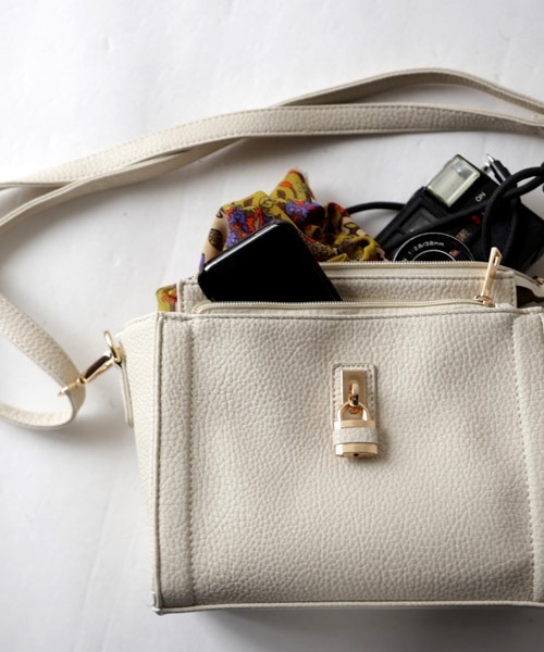 お洒落偏差値上げる“ミニ感”がイイ!可愛い、小さい、“のに”あなどれない機能性。 スマートな収納性、レザーライクならではの気軽さ。フェイクレザーミニサイズショルダーバッグの登場です! コーデをカジュアルダウンさせない、大人思想のショルダーバッグが遂にお披露目です。大人っぽいデザインで、邪魔にならないサイズ感、さらに収納力も兼ね備えたバッグって中々見つからない。これは気軽に使えて、デザインも機能性も満足させてくれる、そんなショルダーバッグなんです。 合皮なのにまるで本革のようなリアルなシボ感のある素材感、そして合皮ならではの軽さで、天候も気にせず気軽に使える点も嬉しいですよね。すぐにバッグのジッパーにアクセス出来る形なので、肩にかけたまますぐに欲しい物が取り出せます。 大きなジッパーポケットが3つ、真ん中のポケットの中はさらに小分け出来るポケットが付いています。すぐに財布や携帯だけ使いたい場合のサブのバッグにしたり、もちろん最小限の荷物を入れてメインのバッグにしたりと、とにかく使いやすいのが嬉しいですよね。 色もブラックとアイボリーでブラックはカッコ良く、アイボリーはブライトカラーならではの抜け感があります。どちらも印象が違うので、色違いで持っていても使えるのでオススメです。