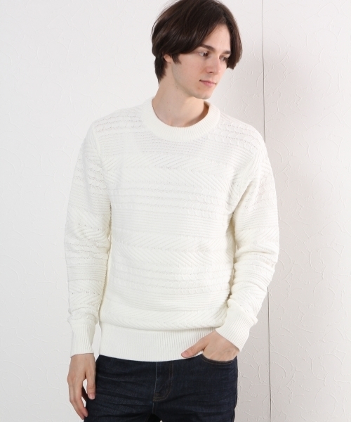 ★軽くて暖か★ボーダー状に編地が折り重なったようなデザインで立体感のあるデザインが目を引く一枚。コットンとアクリルの混合素材でふくらみがあり、軽くて保温性が高い特徴を持っています。一枚着でも存在感抜群で、アウターのインにしてもコーディネートのアクセントになります。