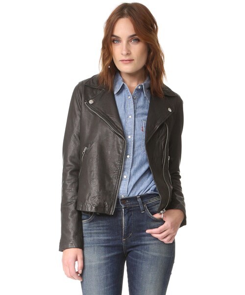 Wrinkling gives this Madewell leather jacket a gently worn look. Zips fasten the placket, 2 pockets, and cuffs. Curved hem. Long sleeves. Lined. Fabric: Lightweight, wrinkled leather. Shell: 100% lambskin. Lining: 100% acetate. Leather clean. Imported, India. Measurements Length: 21.75in / 55cm, from shoulder to front hem Measurements from size L