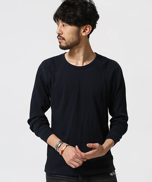 nano・universe the.first.floor. (ナノ・ユニバース ザ ファースト フロアー) シンプルなスタイリングでも映えるワッフル地が魅力定番のワッフル素材のロングスリーブTシャツ。製品洗いを施すことでこなれ感を出しています。目の細かいワッフル地、縫製は3本針で丁寧に仕上げられ、背裏のプリントネームや、脇についたピスネームもポイントです。細かい凹凸による表情が印象でさまざまなスタイリングに応用できる1枚に。洗濯:手洗い可