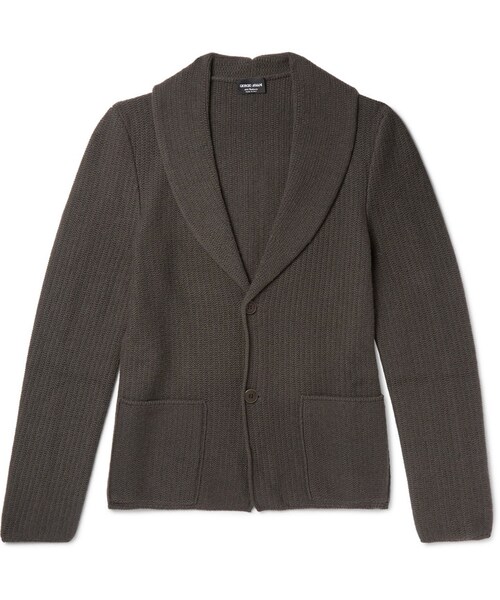 One of Italy's most iconic brands, Giorgio Armani is known for its quality fabrics and exceptional craftsmanship. This shawl-collar cardigan is knitted from naturally insulating cashmere - the thick yarn and textured handle make it feel satisfyingly soft and cosy. The earthy mushroom colour is easy to wear too and works well with dark-blue denim. Fits true to size. Take your normal size This cardigan is designed for a semi-fitted cut Mushroom cashmere Shawl collar, front patch pockets Button fastenings 100% cashmere Dry clean Made in Italy