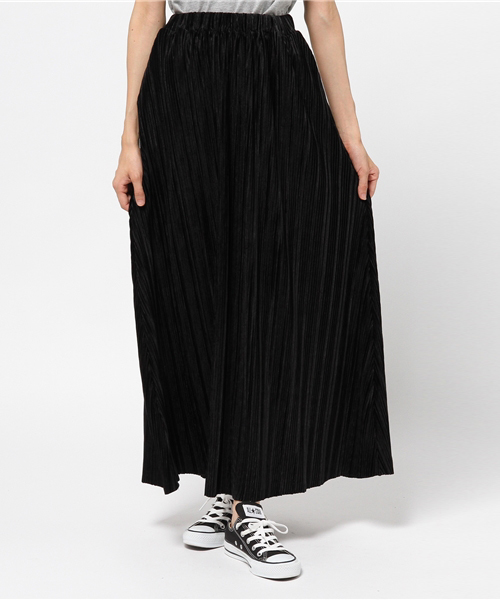 細かいプリーツが 繊細なイメージのロングスカート 歩くたびにゆれる細かなプリーツが 着やせ効果抜群