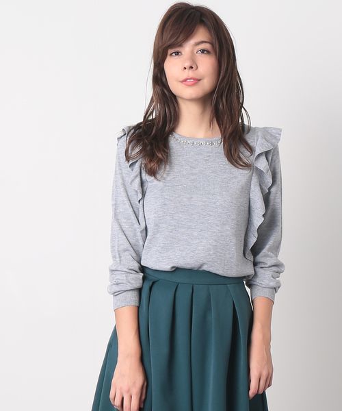 ラッフルのアクセントで華やかさアップ!きらめくビジューがエレガントなフェミニンニット 華やかなビジューをネックラインにあしらった上品なニットプルオーバー。 甘めのラッフルディテールが、今年らしい1枚です。 キレイめボトムで通勤着としてはもちろん、デニム合わせでカジュアルダウンした着こなしも新鮮。 アクセサリー要らずでスタイリングも楽らくな万能トップスです。