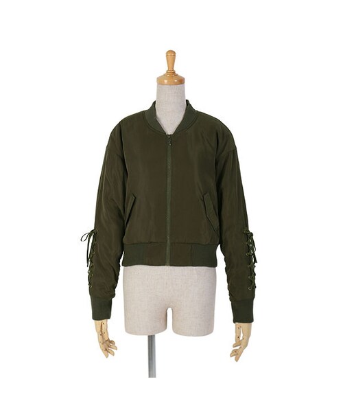 袖のレースアップがキュートなMA-1。 ミリタリーアイテムにガーリーなポイントをプラスした、今季注目のテイストミックスな一品です。 かわいい要素がギュッと詰まったMA-1は今まで苦手だった方にもおすすめ♪ ショート丈がスカートとの相性も抜群なので、ワンピースやガーリーコーデと合わせていつもの着こなしのアクセントに MATERIAL: モデル身長: 158cm 表地,中わた,リブ,裏地 ポリエステル100% made in China サイズ着丈胸囲肩幅袖丈 Free51cm106cm51cm51.5cm
