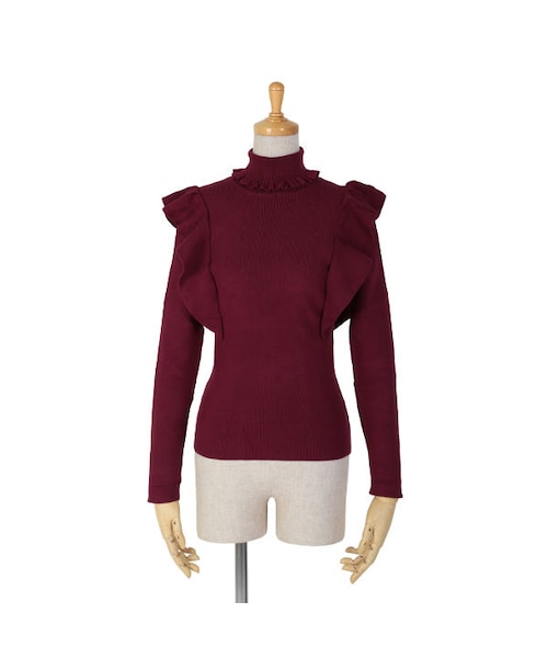 肩の大きなラッフルが目を引くニットプルオーバー。 折り返した衿にあしらったフリルもポイント◎ ボディラインに適度にフィットし、女性らしいシルエットを叶えてくれます。 ミモレ丈のスカートやワイドパンツに合わせて、クラシカルムード満点のコーデを楽しむのがおススメ◎ MATERIAL: モデル身長: 150cm レーヨン60%ナイロン40% made in China サイズ着丈胸囲肩幅袖丈 Free55cm72cm32.5cm56cm
