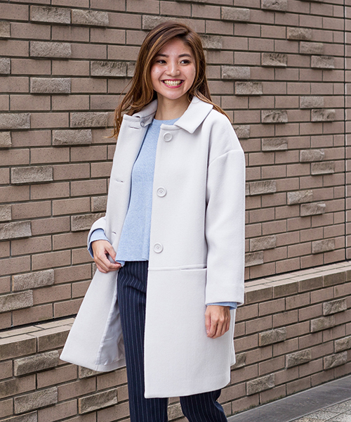 シルエットで見せるダブルモッサコート。直線的なコートもボディをカバーする女性らしいシルエットに、袖通しのよいゆとりのあるデザイン。襟元は釦で取り外しが出来るので、コーディネートに合わせてチェンジ出来ます。通勤や通学までベーシックに活躍してくれる1着です。※襟取り外し可
