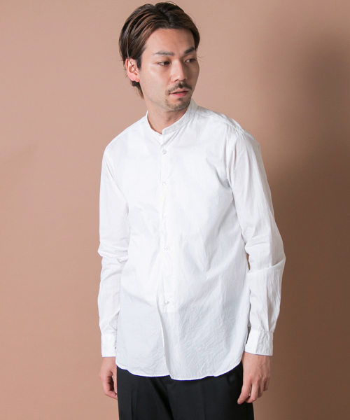 【MADE IN JAPAN / 日本製】繊維が長く上質な生地に適した超長綿「スビン」を使用したJAPAN MADEの定番シャツシリーズ。トレンド感のあるバンドカラーシャツを、ドレスシャツなどに用いられるブロード生地で仕立てた、相反するようにワーク風のディテールを再現しました。洗いざらしのままデニムやチノと合わせるのも、アイロンをかけてオケージョンに使うのも◎。常に手放せない一枚です。