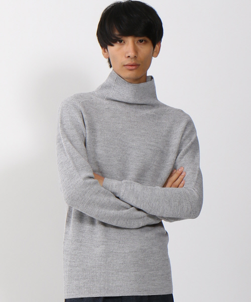 『ドレープが綺麗なタートルネック』 アンチピリングの素材を使用したハイゲージタートルネック。ドレープ性のあるネックラインを作る為に求心編みなどを使い、立体的に仕上げています。
