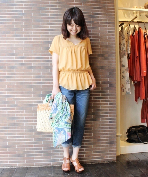 今季注目のぺプラムブラウスが登場! ウエスト部分にゴムが入ったぺプラムのシルエットが着こなしのアクセントに。 透け感のあるジョーゼット素材と、さり気ない胸元のフリルが女性らしさをプラスしてくれます。 シンプルな無地のブラウスは幅広い着こなしに活躍してくれる心強いアイテムです! 今年トレンドの柄パンツとの合わせもオススメ◎ 【お取り扱いについて】・製品染めは、1点1点の色合い、風合い、サイズの違いがあることがあります。また色落ちや色移りの恐れがあります。 ・製品洗いによる、微妙な色、風合い、サイズの違いがあります。 ・デリケートな素材を使用しているので、引っ掛かり、摩擦にお気をつけください。 実際の商品と仕様、加工、サイズが若干異なる場合がございます。 店舗へは下記品番でお問い合わせ下さい。品番:13051400650010