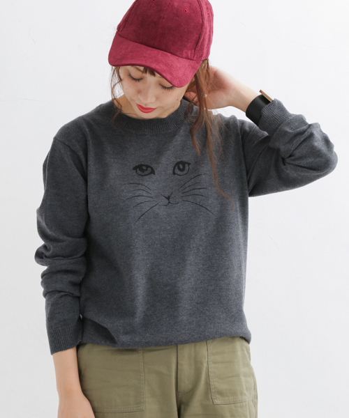 フロントに猫プリントをあしらったキャッチ―なニットプルオーバー。深みのあるカラーで取り揃え落ち着いた印象に。アウターを着て中からちらっと見せても存在感抜群。 ※この商品(ピンク)は、実際はパープルに近い色味です。