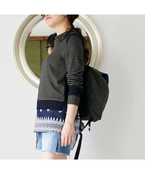 『Mannnequins JAPON(マヌカンズ ジャポン)』のコンセプトは、 『日本人としてのデザイナーが考える<色気のあるヒト(モデル)>をプロダクトを通じて 表現、啓蒙し、探る旅(レーベル)をブランドコンセプトに、 今この時代に存在する意味や価値がある服(プロダクト)のみ製作、発表して行く』 今シーズンのテーマは、『HARMONICS』。 ”様々なコンビネーションによる、ハーモニーで奏でるニュームード”をコンセプトに、 ヴィンテージやブリティッシュの要素をモダン&スポーティーに提案しています。 凹凸感のあるウール混のレーヨンと、 オリジナルで柄をデザインしたバンダナを組み合わせたプルオーバーチュニック。 しかもこのバンダナ柄、ニットの編み地がモチーフで、 アシメトリーのタックでスカート部分をデザイン。 バンダナには目がない上に、こんな可愛いなんて即決です! 見頃からの続きのスタンドカラー、後ろは袖口切り替えで配色アクセント。 今シーズンはバギーラインの太めボトムや、あえてのスカートとのバランスもオススメです!
