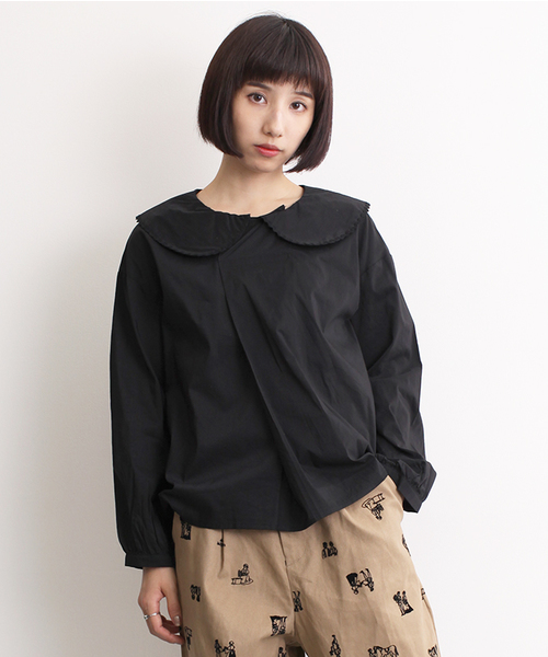 丸くて大きな襟のふちには、なみなみのテープが付いています。 フロントタックで立体感のあるデザイン。 1枚でも主役になるブラウスですが、ニットやオールインワンのインナーとしても存在感があっておススメです。