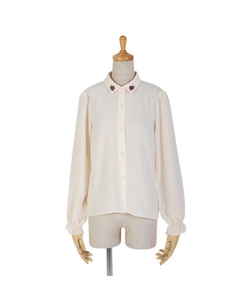 衿に施されたローズ刺繡が目を惹く一品。 シンプルなアイテムでありながら、キュッとしぼったお袖や、てろんとした肌触りの良い素材感が上品で可愛らしい印象を与えます。 一枚ではもちろん、カーディガンやワンピースを重ねてガーリーに着こなすのもおすすめ♪ MATERIAL: モデル身長: 158cm 本体 ポリエステル100% 刺繍糸 ポリエステル100% made in China サイズ着丈胸囲肩幅袖丈 Free59cm98cm34cm59cm