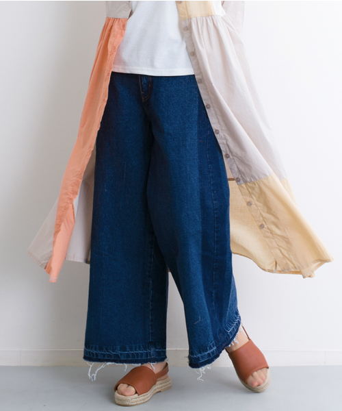サイドライン風に染めになったデザインが新鮮なデニム。裾は切っぱなしのラフなスタイル。 はっきりとしたライン入りよりは挑戦しやすく旬なスタイルを作れるアイテムです。