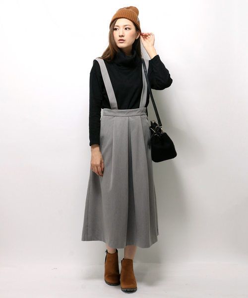 ちょっぴりレトロな雰囲気のサスペンダー付きスカート。適度なボリュームとタックの作る立体的なフレアがとってもきれいなアイテムです。ウエストの左ボタンがアイキャッチ効果を発揮するポイントに。サスペンダーは取り外しができ、スカート単体でも使用して頂けるため、コーディネートの幅もグンと広がるアイテムです。