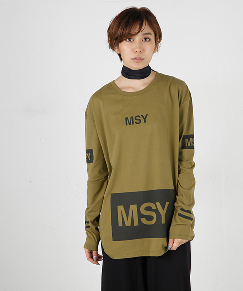 【MULTI LOGO L/S TSJ】 MSYというMOUSSYを略したロゴがいくつもプリントされたアイテム。21という数字はMOUSSYの誕生日。カラーは合わせやすい秋カラーに。