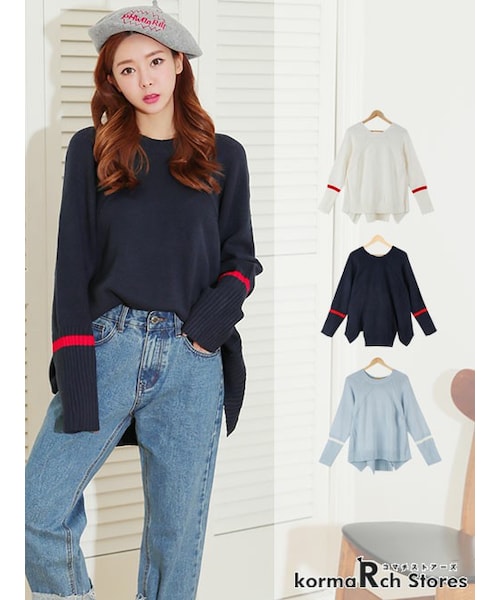 【アンバランスロングスリーブレスニット】カフスのライン配色でポイントを与えた素敵なニット!軽く広がるaラインシルエットとパクたオ・バフェットです。
