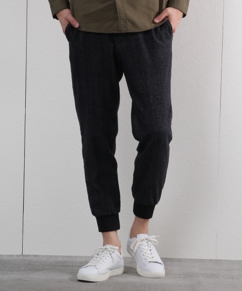 ★温かくきれいなシルエット★ ウール混素材で見た目にも温かみのあるパンツ。 すっきりとしたテーパードシルエットで裾リブ仕様なので、カジュアルからきれい目まで幅広いスタイルに対応します。 バックポケットはフラップとジップの左右異なるデザインでアクセントになります。 ウエストはコード仕様なので楽に穿けてシルエットもきれいないいとこ取りの一本です。