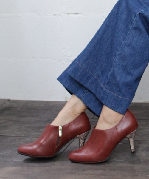 パンプスのようなエレガントフォルムがきれいなストレートヒールのブーティ。 高級感が決めてのエレガントブーティはかかと部分にゴールドのラインを施して後ろ姿にも華やかさをプラスしたこだわりの一足。 地面に向かってまっすぐに落ちるストレートヒールシルエットもプチプラシューズではなかなか見かけないシルエット。美脚にみえるようつま先のシルエットはポインテッドトゥに。 かかと部分には光沢感のあるクロコ調素材で仕上げトレンド感と大人っぽさをアピール。 前後できりかえした異素材のコンビネーションが個性を引き立てます。 大人の女性らしい、上品でエレガントな足元が完成します。 ブーツ内側はウレタンのメッシュ素材なので通気性もよく、足あたりも柔らか。 内側にはサイドファスナーがあって着脱も楽々。 パンプスのように足にフィットしたシルエットでトレンドのワイドボトムと合わせやすいのがオススメポイント。