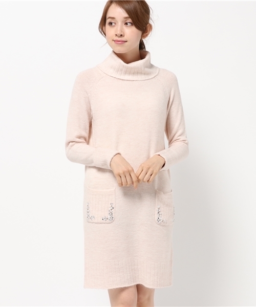 Iラインで着こなせるタートルニットワンピース!ポケ分部にはキラリと光る、ジュエルをドッキングして、エディコロらしい可愛さを添えています。温もり感じるキレイな風合いも魅力となり、長めの着丈に、袖先や裾にリブを施してのっぺりしない1枚です。裏地ナシなので、お手持ちのペチコートと合わせると◎です。