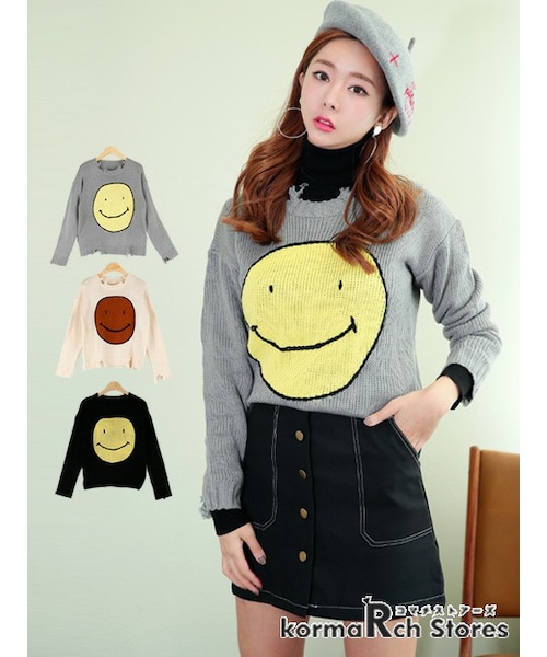 【スマイルプリントヴィンテージニット】かわいいスマイルプリントディテールのニットです。袖とネックラインの部分と裾にディテールを与えヴィンテージさを加えました。