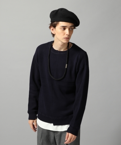 ソフトゲージと言われる編み方で独特な表面感に仕上げたデザインニット。カットソーに近い柔らかさを持った素材感で非常に着心地の良いアイテムです。柔らかな雰囲気なので、切り替え、段違いのデザインを入れアクセントにしています。トレンドのタックインスタイルにも◎